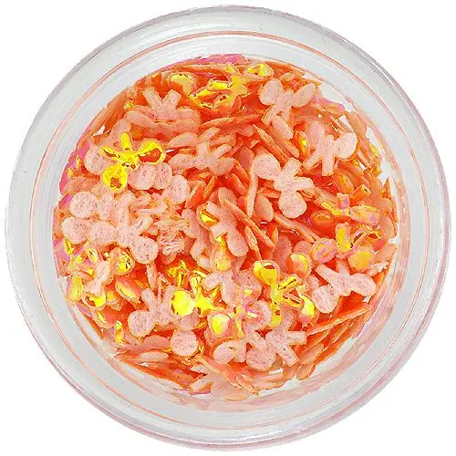 Fundițe portocalii din material cu reflecții sidefate, ideale pentru decorarea unghiilor naturale, acrilice sau cu gel. Conferă unghiilor un aspect original și unic. Pentru o aplicare mai ușoară se recomandă utilizarea unui creion de unghii sau unui bețișor de lemn de portocal.