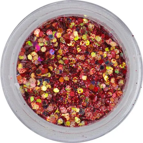 Confetti roşu în pulbere de sclipici, cu reflexii în culorile curcubeului. Decoraţiunea este potrivită pentru tehnicile nail art de decorare a unghiilor din gel şi din acrilic. Confetti nail art cu reflexii, în forma unor hexagoane roşii în pulbere de sclipici.