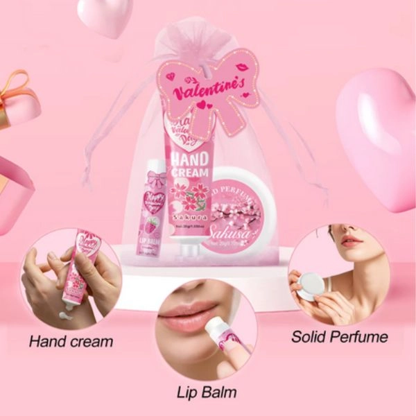 Set cadou cu balsam de buze, cremă de mâini și parfum solid.