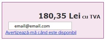- Dacă sunteți interesat de unele produse care sunt momentan epuizate, vă rugăm să vă introduceți adresa de e-mail în căsuța de pe pagina produsului respectiv. Imediat ce produsul va fi disponibil și va putea fi comandat, veți fi automat înștiințat.